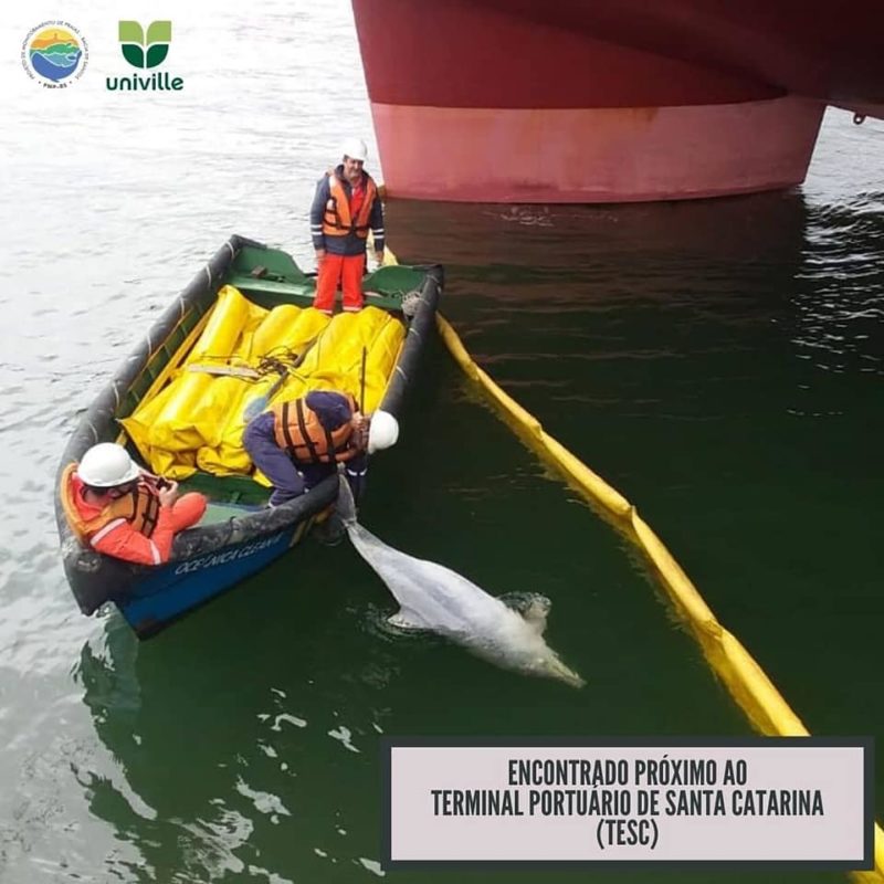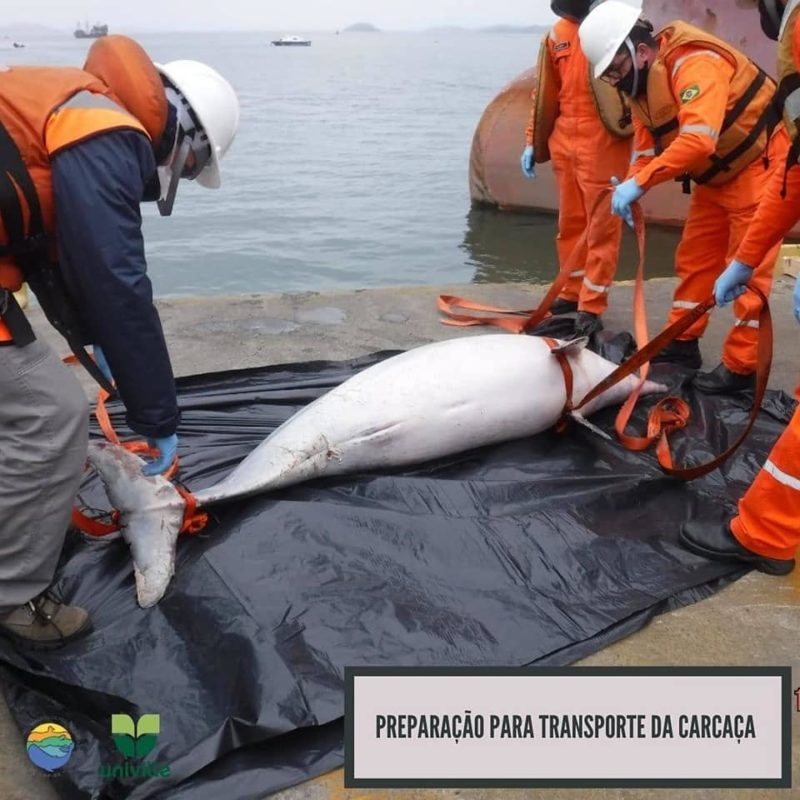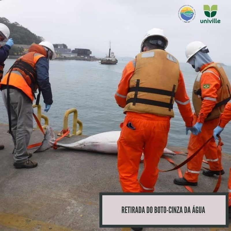 A equipe do Projeto de Monitoramento de Praias BS/Univille recebeu vários acionamentos e foi até o local onde o animal estava, próximo ao porto. Com a ajuda dos funcionários, inclusive, o boto-cinza já em processo de decomposição foi recolhido e passará por necropsia.