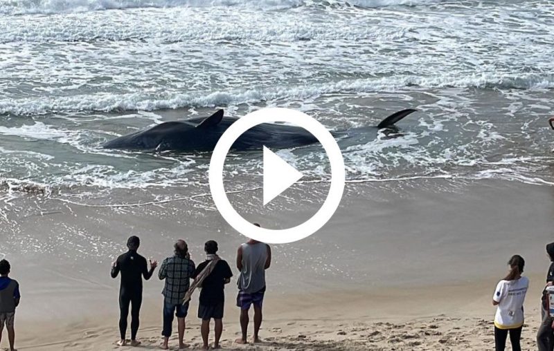 Vídeos, compartilhados nas redes sociais, mostram a baleia encalhada na areia da praia. Nas imagens é possível ver que algumas pessoas tentaram ajudar o animal a retornar para o mar.