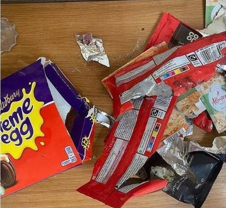 Ela supõe que a porta do cômodo deve ter sido deixada entreaberta, então, o cachorro farejou e devorou os doces.