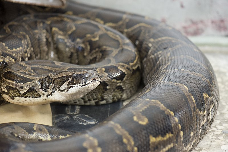 A píton-de-burma é outra espécie comercializada como animal de estimação. O problema é que, por ser muito grande e requerer muitos cuidados, é comumente dispensada em ambientes naturais, o que traz impactos à fauna nativa, já que é uma predadora voraz que precisa de muito alimento. – Foto: LiCheng Shih/Wikimedia