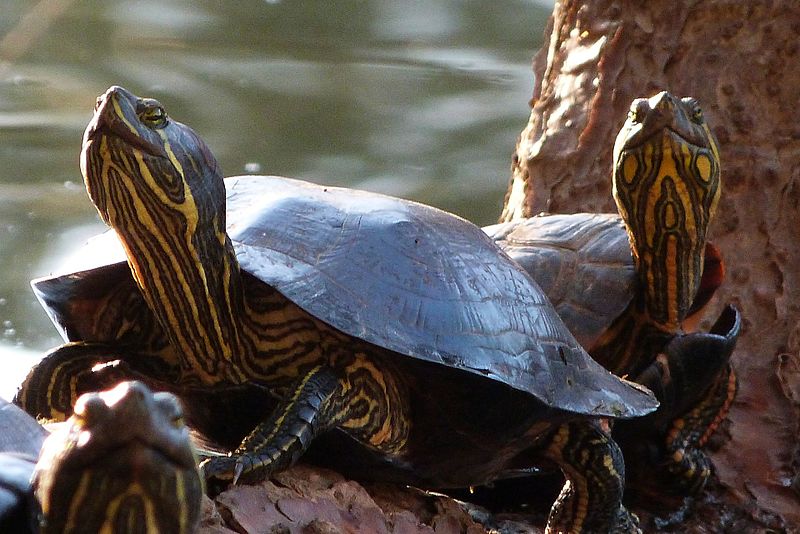 As tartarugas tigre-d’água são comercializadas como animais de estimação no Brasil e vivem aproximadamente 30 anos. O problema é que muitas são abandonadas em parques urbanos ou outras áreas naturais e acabam oferecendo risco porque ocupam o espaço de alimentação, repouso e reprodução de outras espécies, como o cágado, que está em seu habitat natural. – Foto: Evaldo Resende/Wikimedia