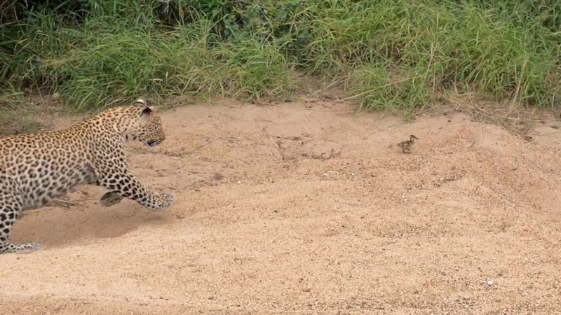 Enquanto o leopardo estava distraído, o ganso aproveitou a oportunidade para escapar e se juntar aos outros gansos escondidos nos arbustos. Ele escapou com sucesso do predador. Foi uma reviravolta inesperada. – Foto: LatestSightings/ND