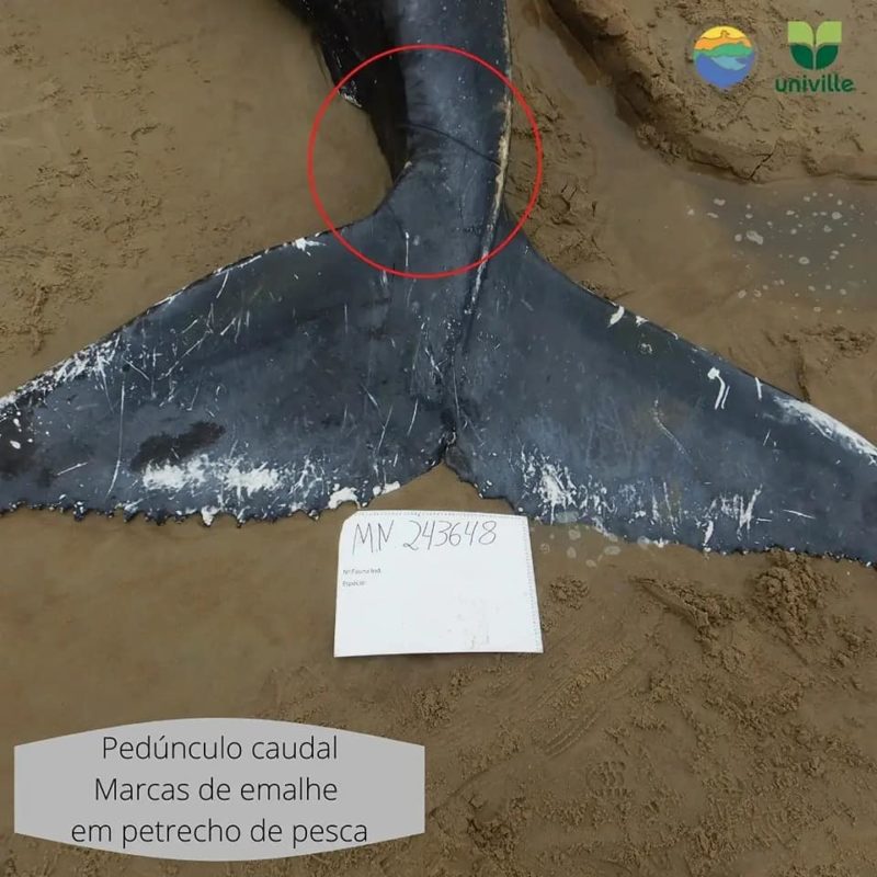 O animal apresentava marcas de rede de pesca nas nadadeiras e fragmentos do material nas barbatanas. Materiais foram colhidos para análise e a carcaça foi enterrada na praia onde ocorreu o encalhe.