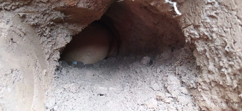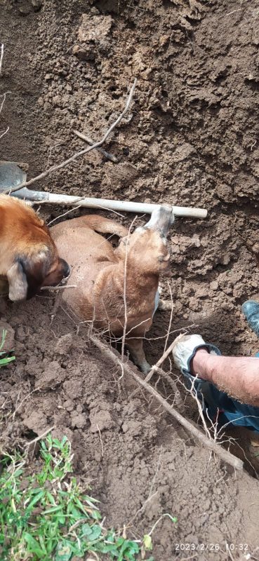 Após abertura de uma vala de aproximadamente um metro de profundidade por três metros de comprimento, feita pela máquina, foram avistadas duas tocas. Em uma delas estava o cão e o ratão-do-banhado.