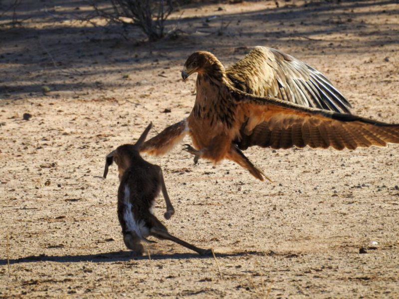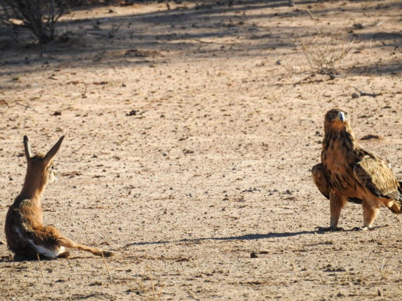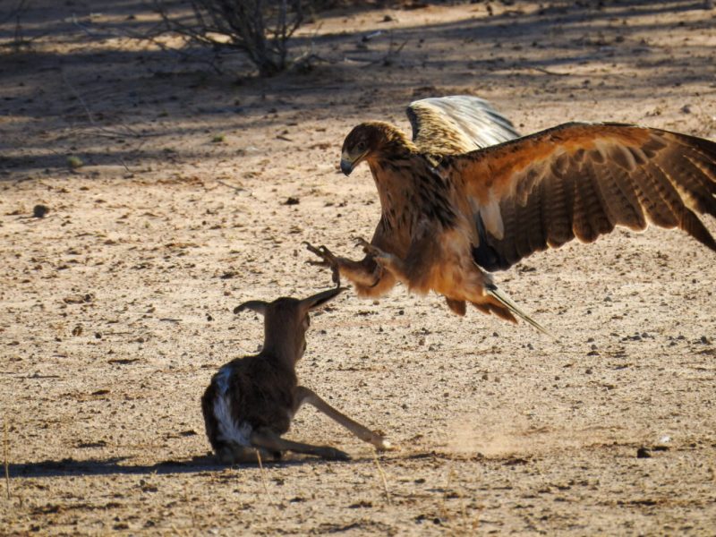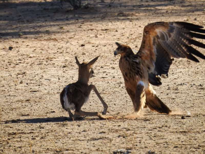 Em uma manhã tranquila no Parque Kgalagadi na África do Sul, o entusiasta da natureza, Tony Ferri, presenciou uma cena impressionante de duas águias tentando pegar um filhote de cervo abandonado pelo rebanho. - 2 de 8