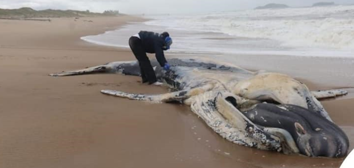 Um filhote de baleia-jubarte (Megaptera novaeangliae) foi encontrado morto na praia de Balneário Barra do Sul, Litoral Norte de Santa Catarina, no domingo (20). – Unidade de Estabilização de Animais Marinhos da Univille PMP-BS Trecho 05/Divulgação ND