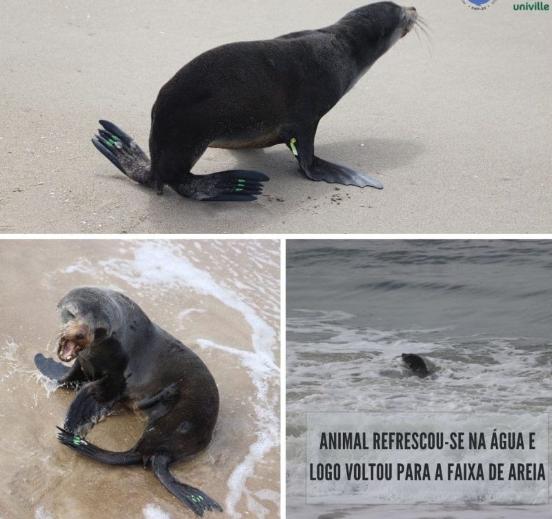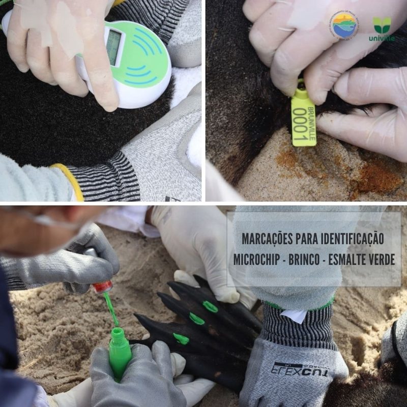 O lobinho recebeu um brinco de identificação individual na nadadeira peitoral direita (BR/Univille 0001), um microchip e ainda teve as unhas das nadadeiras posteriores pintadas de verde. Este procedimento de marcação facilita a identificação do animal e acompanhamento do seu deslocamento.