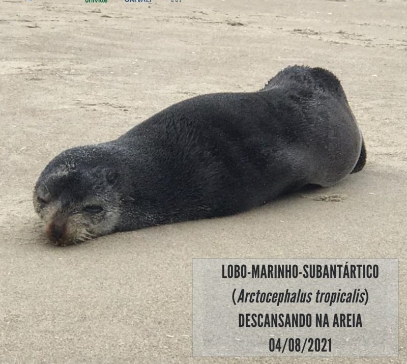 Imediatamente, um técnico de campo foi até o local e verificou que se tratava de um lobo-marinho-subantártico (Arctocephalus tropicalis) juvenil descansando, na faixa de areia.