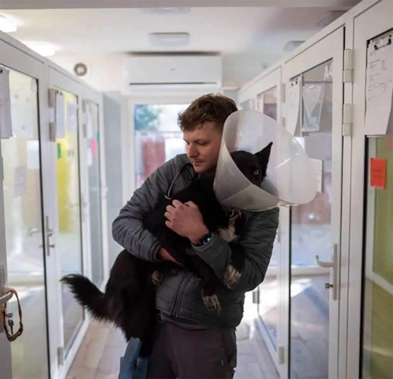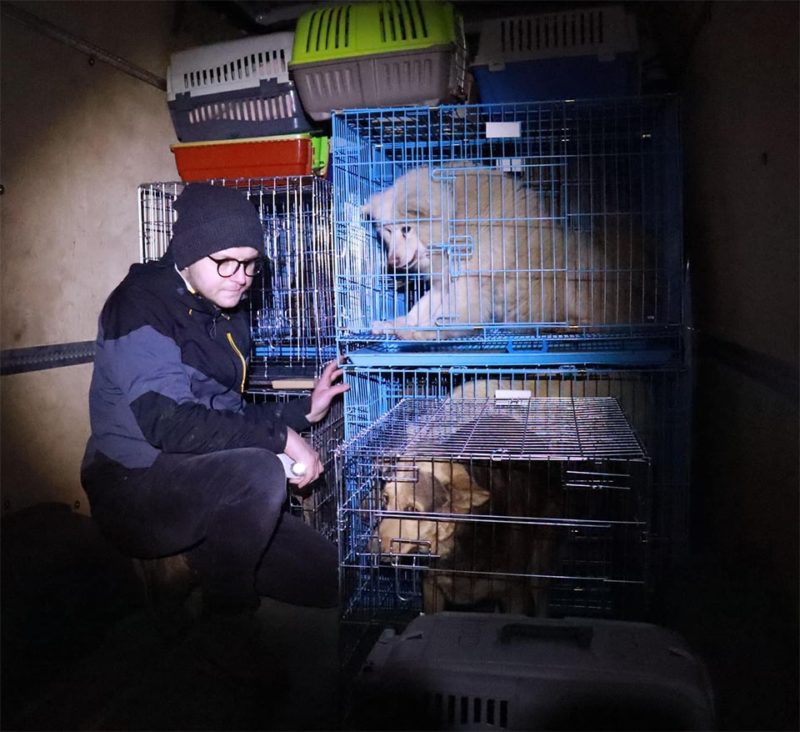 Através de campanhas de resgate realizadas por diferentes organizações de animais da fronteira com a Polônia, o veterinário fez sua última viagem à zona de guerra na semana passada, como parte de um comboio de Przemysl.