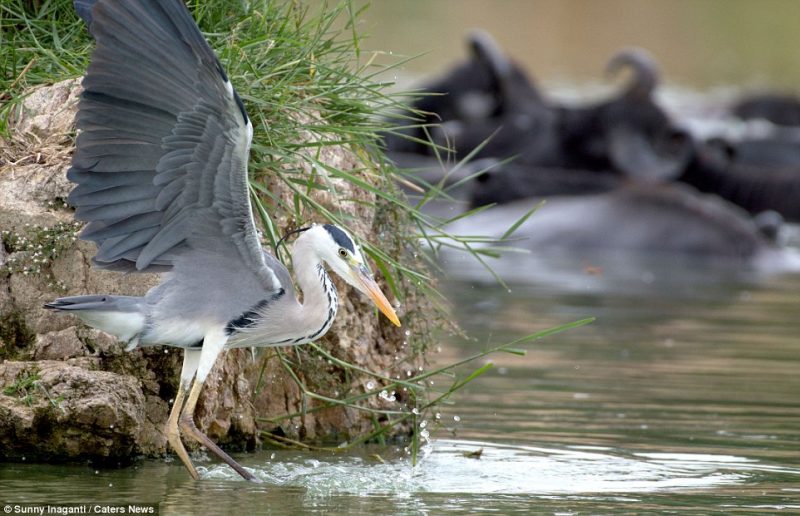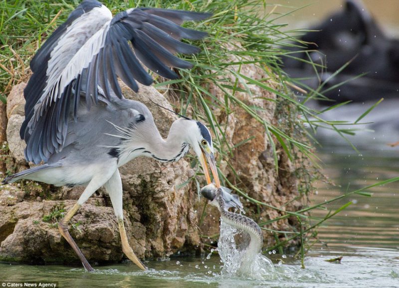 Com a cobra perdida na água, a garça rapidamente mordeu sua comida – Foto: Sunny Inaganti/Caters News/ND - 10 de 10