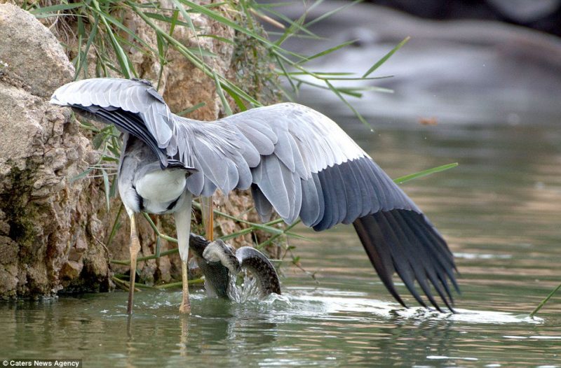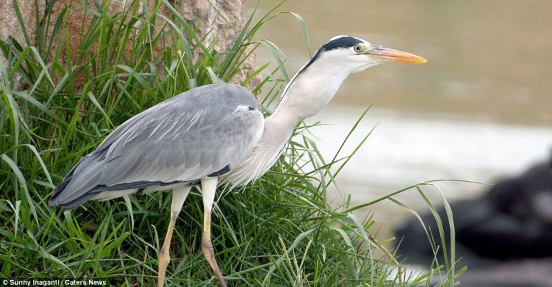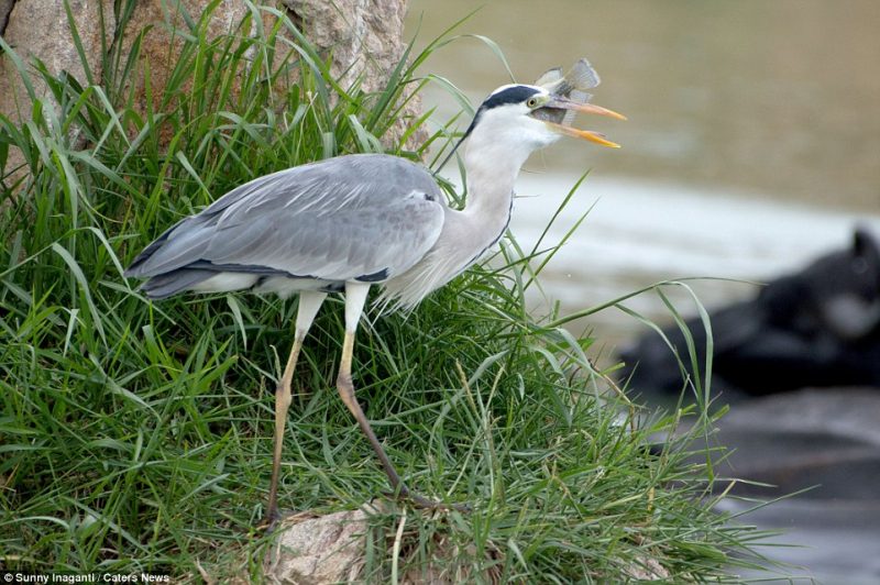 Os restos mortais do peixe são claramente visivel definhando na garganta da garça – Foto: Sunny Inaganti/Caters News/ND