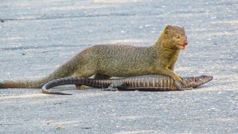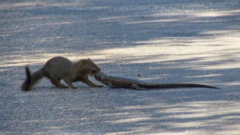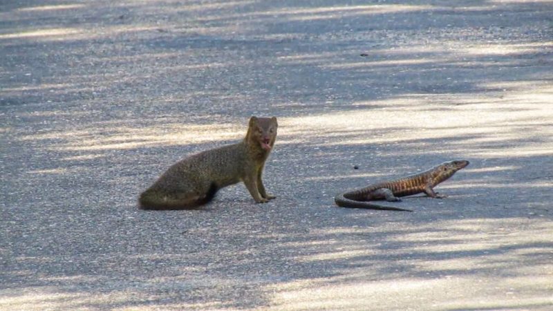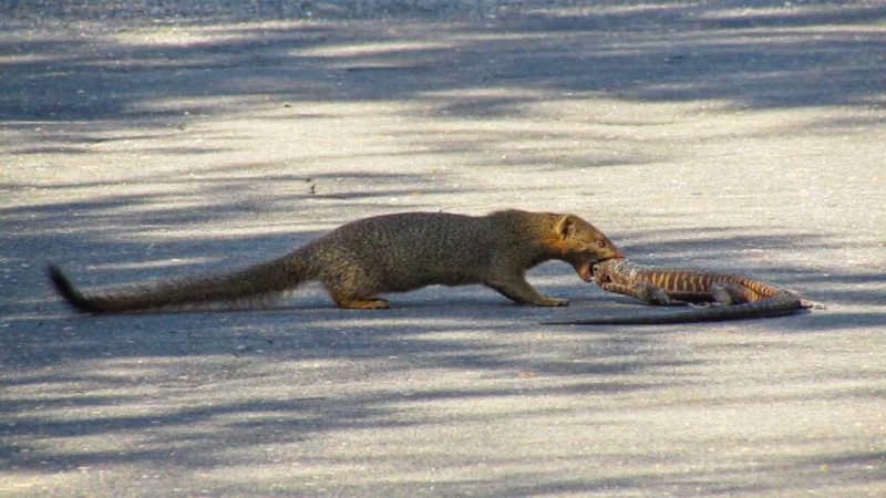 O mangusto não parou por aí e persistiu até conseguir arrastar o lagarto inteiro pela estrada. Nesse ponto perdemos o visual, mas estava claro o que iria acontecer.” – Foto: Maitseo Matlou/Latest Sightings/ND