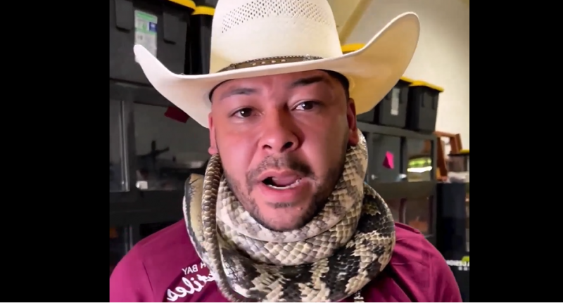 Homem exibe-se com uma serpente no pescoço – Foto: Reprodução vídeo/Divulgação/ND