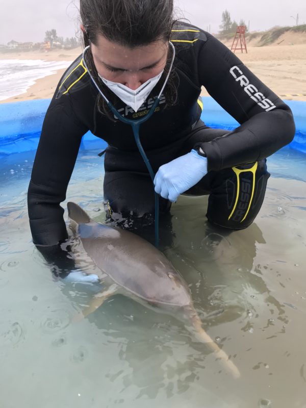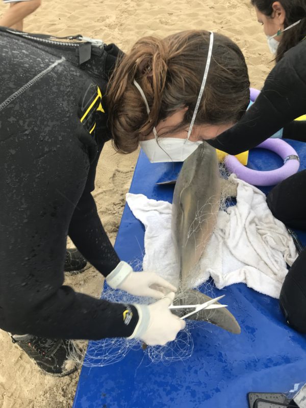 “É um momento de grande emoção, mas também de muita apreensão. A toninha é um animal bastante sensível e essa nos chegou muito enrolada na rede, o que tornou o salvamento mais delicado”, fala a coordenadora geral do PMP-BS-Univille, Jenyffer Vierheller.