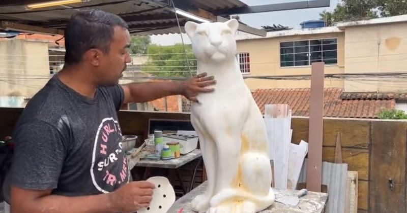 Depois de secar, ele retira a forma e deixa o gesso secar por cerca de sete dias. O próximo passo é lixar a pantera para tirar imperfeições na peça. Em seguida, o pedreiro explica que é importante aplicar um fundo preparador para selar o objeto e a tinta não descascar com facilidade.