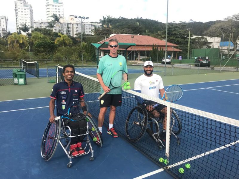 Daniel Rodrigues é natural de Belo Horizonte, mas treina esta temporada em Itajaí, na ADK Tennis. No dia 8 de agosto ele embarca para Tóquio, para disputar as Paralimpíadas. Essa é a terceira olimpíada do atleta, que disputou em Londres, em 2012, e no Rio, em 2016. Para ele, a expectativa é muito boa, “graças a Deus”, conta. Na foto, da esquerda para direita: Ymanitu Silva, o técnico Patrício Arnold e Daniel Rodrigues – Foto: ADK Tennis/Divulgação