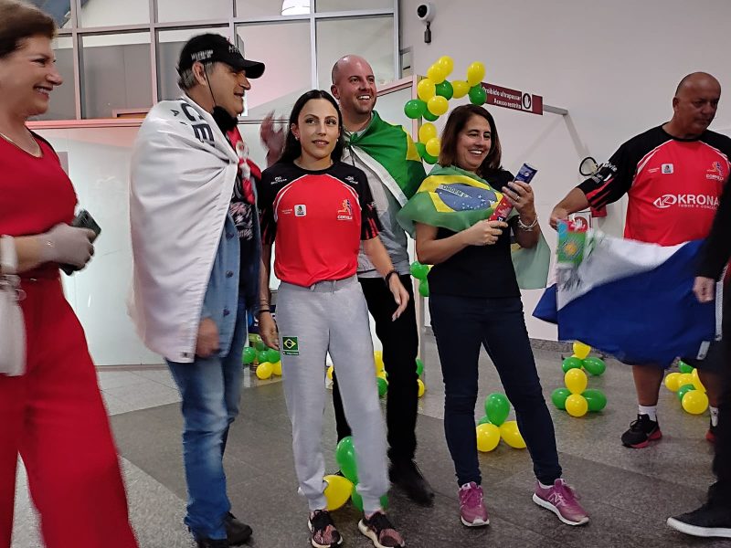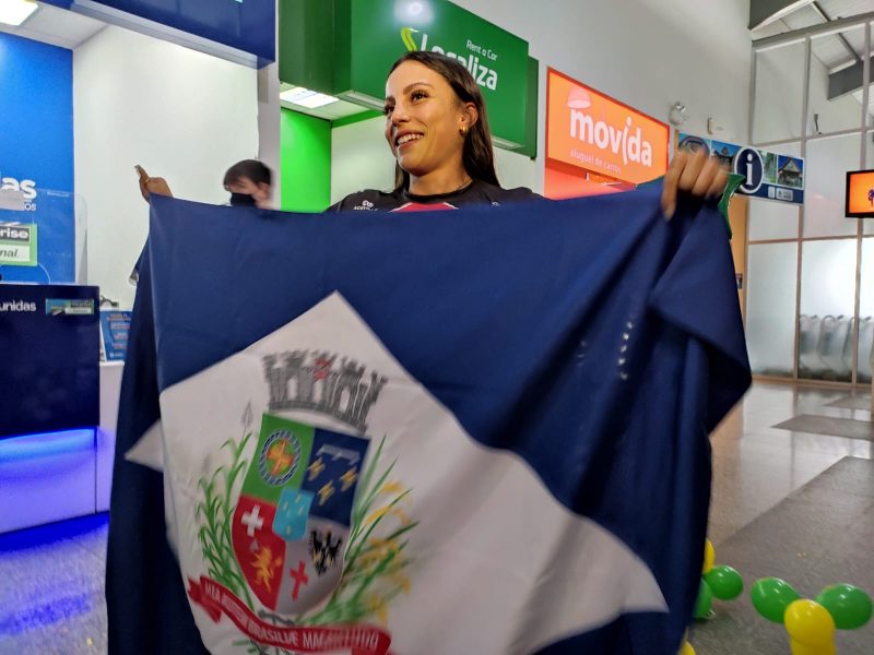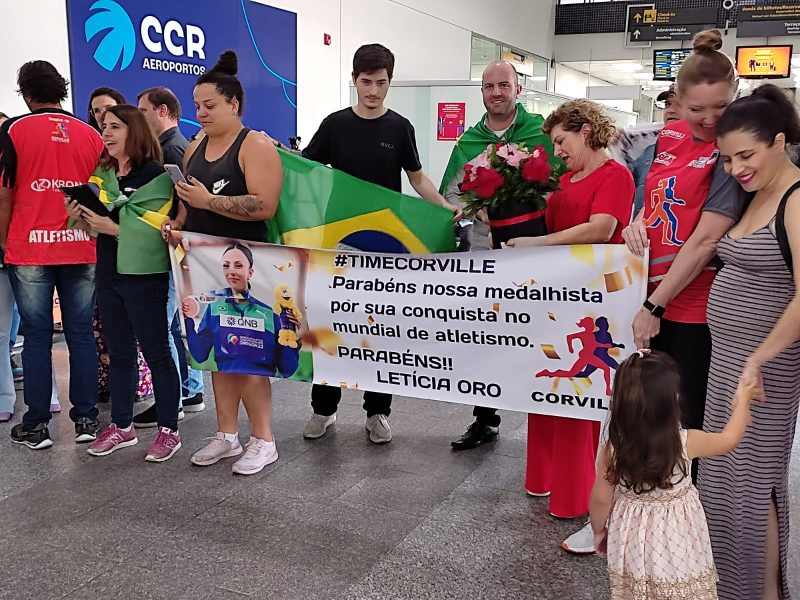 Com a medalha de bronze conquistada no Mundial de Atletismo no peito, a joinvilense Leticia Oro Melo voltou para casa nesta terça-feira (26). Ela foi recebida com muita festa por volta das 14h50 no aeroporto da cidade pela família, amigos, treinador, além de receber uma bandeira de Joinville.