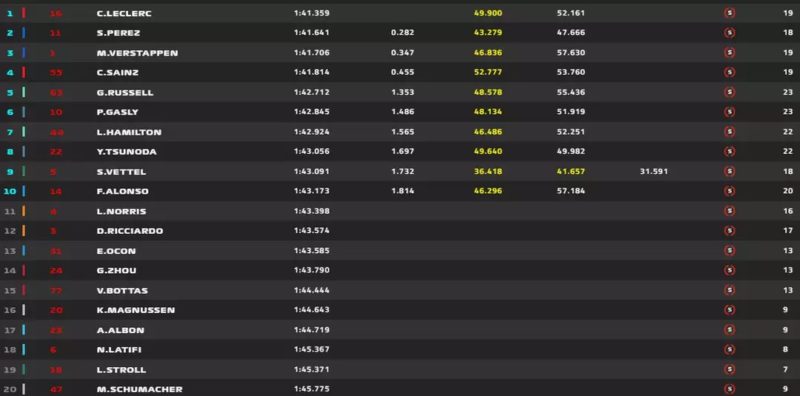 A sessão ainda foi marcada por uma bandeira vermelha em sua reta final, quando Lance Stroll bateu sua Aston Martin na barreira de proteção e não conseguiu retornar a disputa. Os eliminados foram: Magnussen, Albon, Latifi, Stroll e Schumacher.
