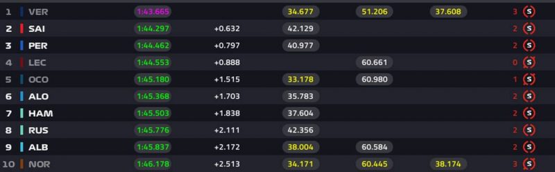 No Q2, quem terminou no topo foi Leclerc. Verstappen, Pérez e Sainz vieram em seguida. Ricciardo, Gasly, Zhou, Srtoll e Schumacher ficaram nas últimas posições.