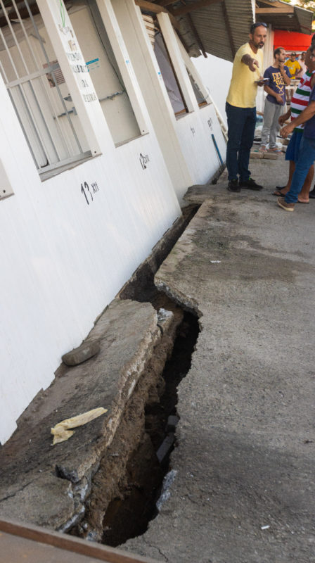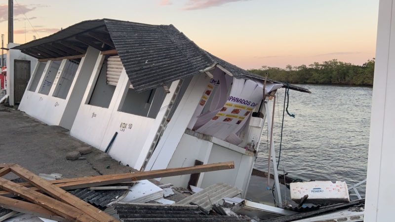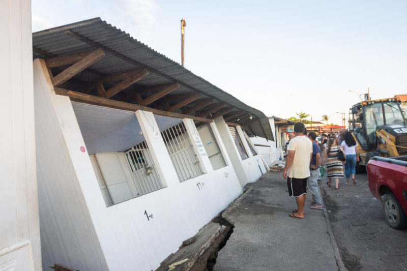 “Um dia antes, eu já estava preocupado com o piso rachado. Preocupado que o pior poderia acontecer”, relata o pescador Paulo Zapella. Na hora do estouro das barracas, Paulo estava acompanhado da mãe, da esposa e da filha, que também trabalhavam na barraca. Ninguém se feriu.- Foto: Divulgação Defesa Civil