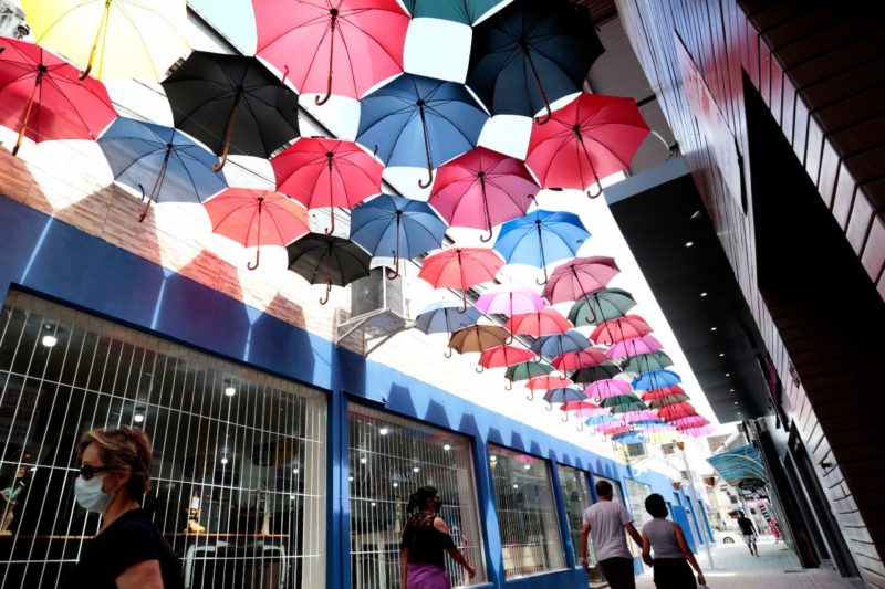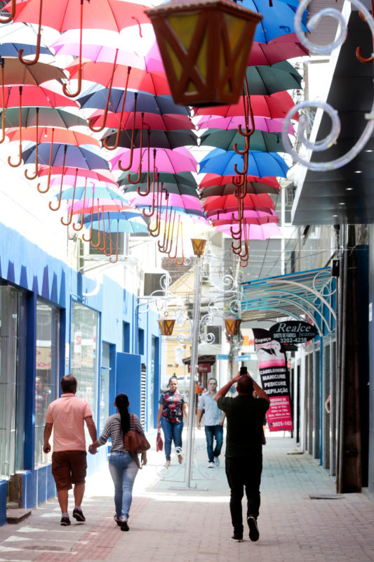 Um céu de guarda-chuvas. Tudo a ver com Joinville né? A novidade agradou o público. Além de comentários bem-humorados, o rótulo de “cidade da chuva” inspirou a criação de um novo atrativo para o Centro de Joinville: os guarda-chuvas trouxeram mais cor, beleza e movimentação à travessa Mato Grosso, no trecho entre as ruas XV de Novembro e 9 de Março.