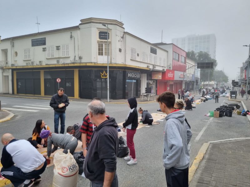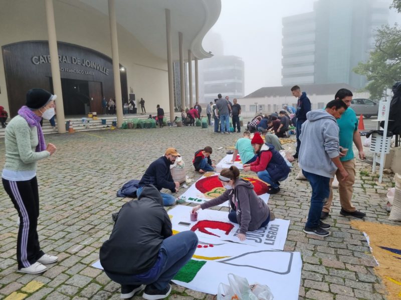 Nem a neblina baixa que cobriu Joinville na manhã desta quinta-feira (16) espantou os fiéis dedicados a confeccionar os tapetes de Corpus Christi na cidade do Norte de Santa Catarina.
