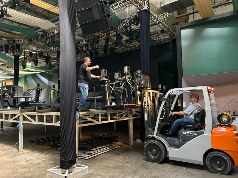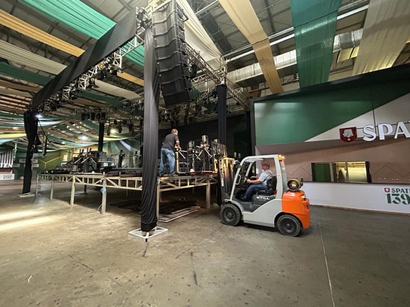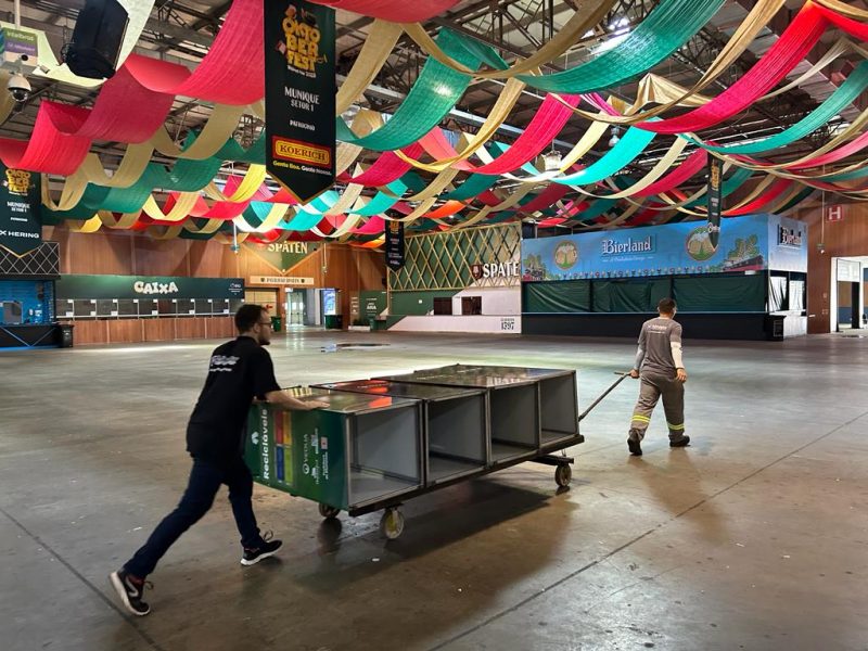 Agora, com o declínio do nível do Rio Itajaí-Açu e com as previsões positivas para os próximos dias, a montagem da Oktoberfest recomeçou nesta segunda-feira (9). – Foto: Rodrigo Vieira NDTV - 3 de 4