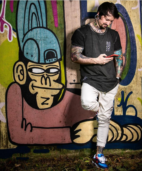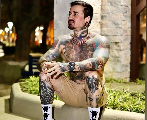 Com 70% do corpo tatuado, o jaraguaense também é músico, artista plástico e skatista .