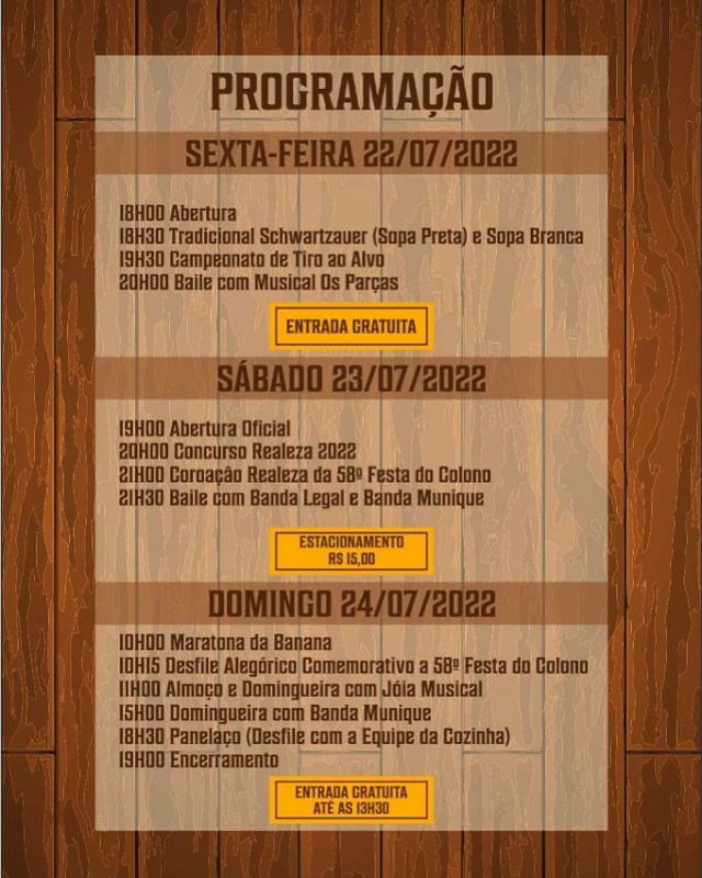 Na programação, atrações para todos os públicos, como a escolha da realeza que será realizada no sábado (23) às 20h, bailes, desfile alegórico e a curiosa maratona da banana. A festa começou há mais de 60 anos, quando era chamada de Festa da Banana e a sede da sociedade ainda não havia sido construída.