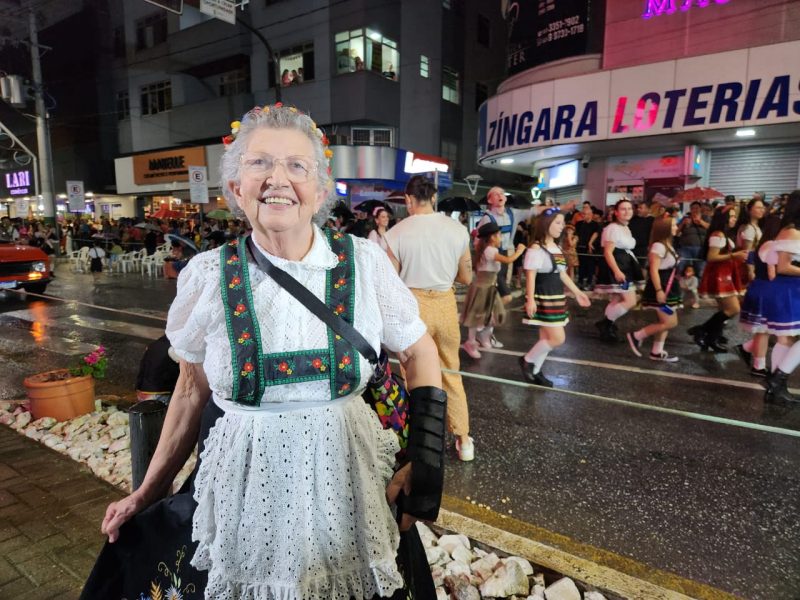 Dona Vanda Itso de Souza, de 76 anos, é moradora do Centro e participa da festa desde a primeira edição. Devidamente trajada, ela foi ao Centro prestigiar o desfile. “Está muito animado, muito divertido. A chuva faz parte”, afirma entre sorrisos, antes de seguir com as milhares de pessoas para o pavilhão, onde a Fenarreco segue até madrugada.