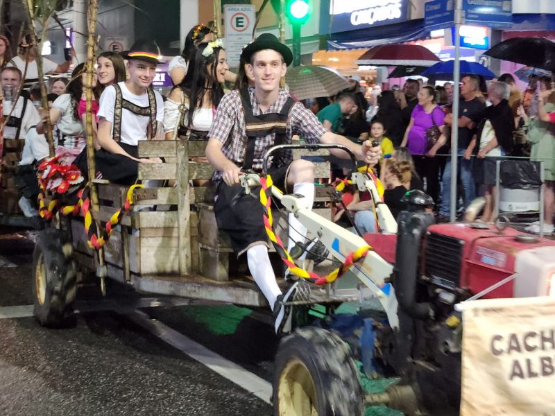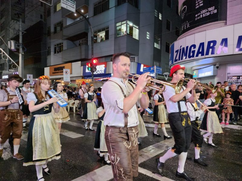Ao som das tradicionais músicas germânicas, cerca de 5 mil pessoas cruzaram a avenida Cônsul Carlos Renaux para celebrar a retomada da 36ª Fenarreco, no final da tarde desta quarta-feira (11). Com o desfile, começou também a chuva que não espantou os fenafesteiros, que seguiram animados.