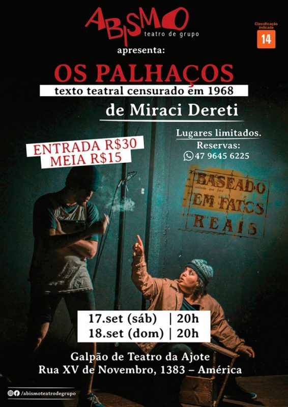 O Abismo Teatro de Grupo apresenta a peça Os Palhaços, cujo texto foi censurado no período da Ditadura Militar. “Mostrar a realidade neste período era perigoso, pois a dramaturgia apresenta lideranças morais, religiosas e políticas que ficavam distantes da realidade do povo. O texto é o mesmo, mas o Abismo provoca com uma montagem que condiz com a atualidade”, diz a sinopse. As apresentações ocorrem no sábado (17) e no domingo (18), às 20h, no galpão da Ajote. – Foto: Divulgação/ND
