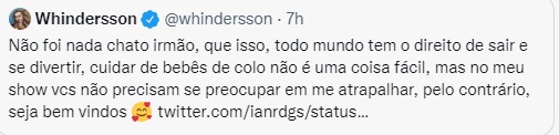 Whindersson respondeu ao pai da criança, negando que a situação tenha sido chata: “Que isso, todo mundo tem o direito de sair e se divertir, cuidar de bebês de colo não é uma coisa fácil, mas no meu show vocês não precisam se preocupar em me atrapalhar, pelo contrário, sejam bem-vindos”, escreveu.