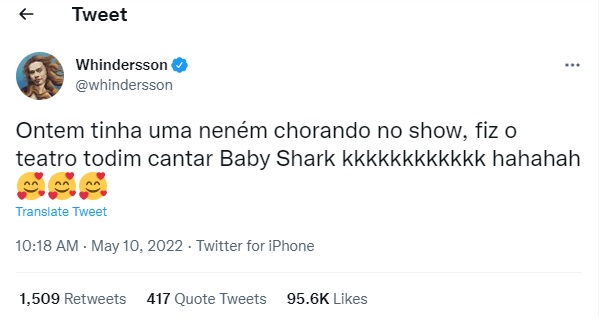 Whindersson Nunes fez todo o teatro cantar Baby Shark para tentar acalmar a bebê – Foto: Reprodução vídeo/Divulgação ND“Ontem tinha uma neném chorando no show, fiz o teatro todinho cantar Baby Shark”, escreveu ele no Twitter.