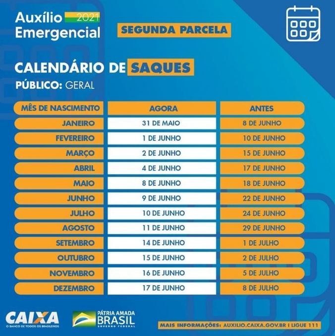 O governo federal finaliza neste domingo (30) o pagamento da segunda parcela do auxílio emergencial. Para os 2,32 milhões que nasceram em dezembro o repasse totalizará R$ 480,3 milhões. O saque em dinheiro para o grupo poderá ser feito a partir do dia 17 de junho.