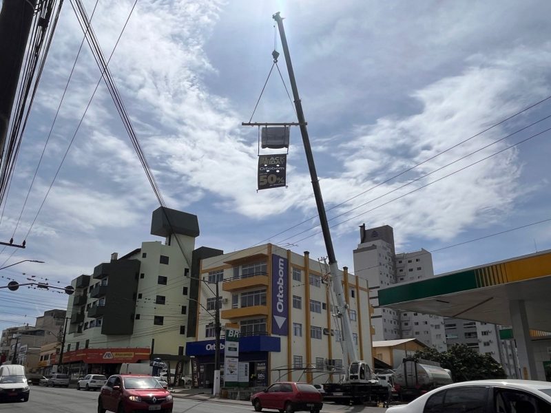 Uma loja de colchões localizada na Avenida São Pedro, no bairro São Cristóvão, usou um guindaste para levantar um colchão a vários metros de altura. – Foto: Willian Ricardo/ND