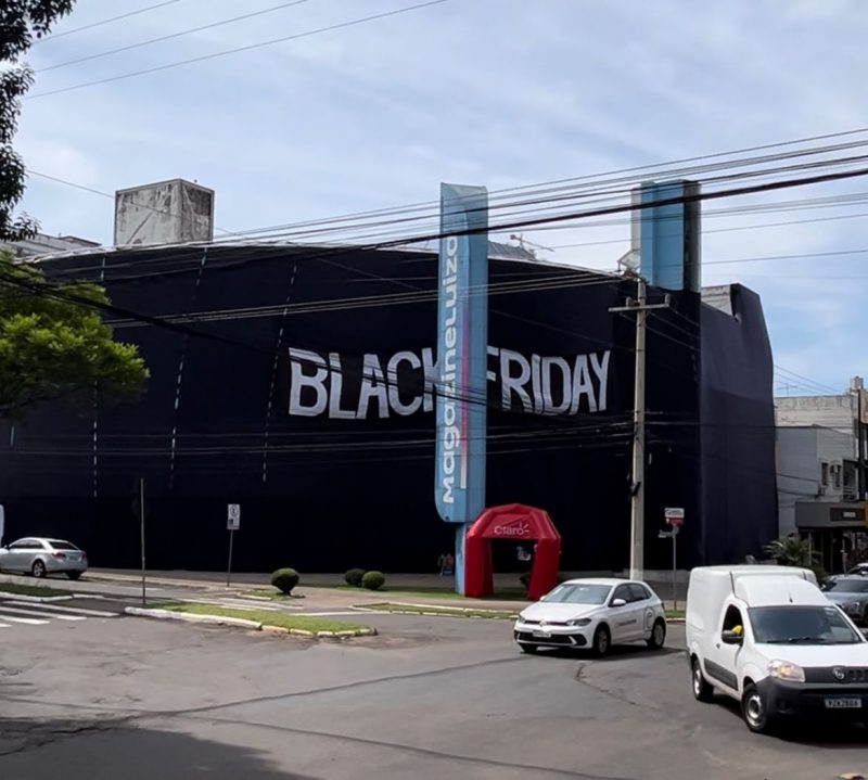 Uma loja de eletrodomésticos, no Centro de Chapecó, cobriu toda a fachada com panos pretos e letras enormes com a palavra black friday. Apenas a entrada principal ficou liberada. A estratégia é criar um clima de mistério e curiosidade nos clientes. – Foto: Willian Ricardo/ND