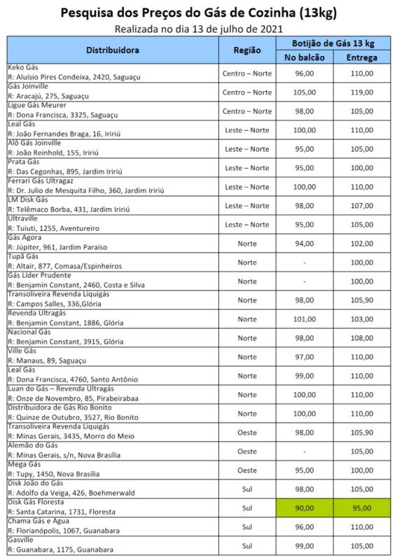 Valores do gás de cozinha em Joinville – Foto: Prefeitura de Joinville/Reprodução/NDJá os preços mais altos foram de R$ 105 (retirada do balcão) e R$ 119 (entrega em domicílio), no bairro Saguaçu.