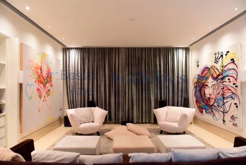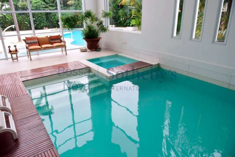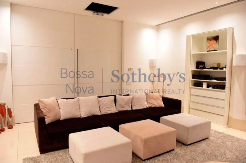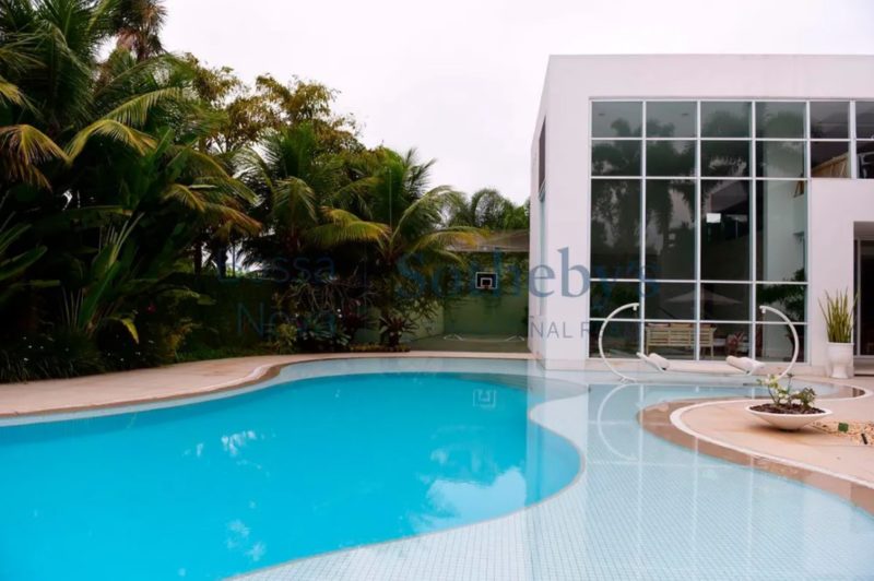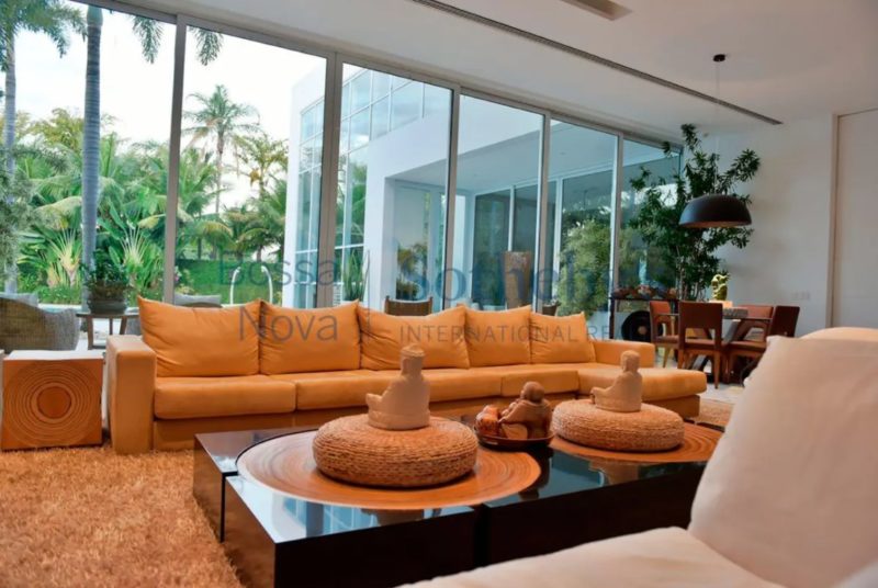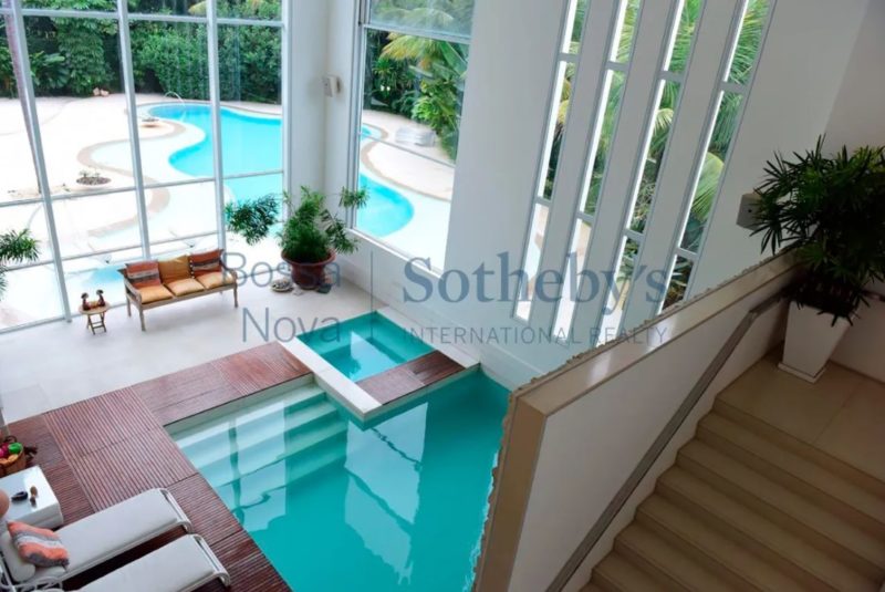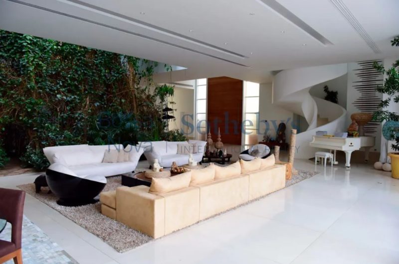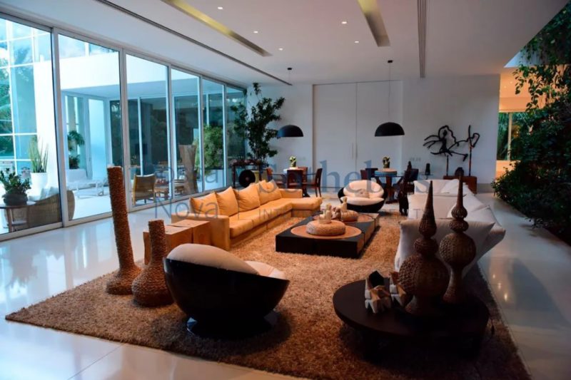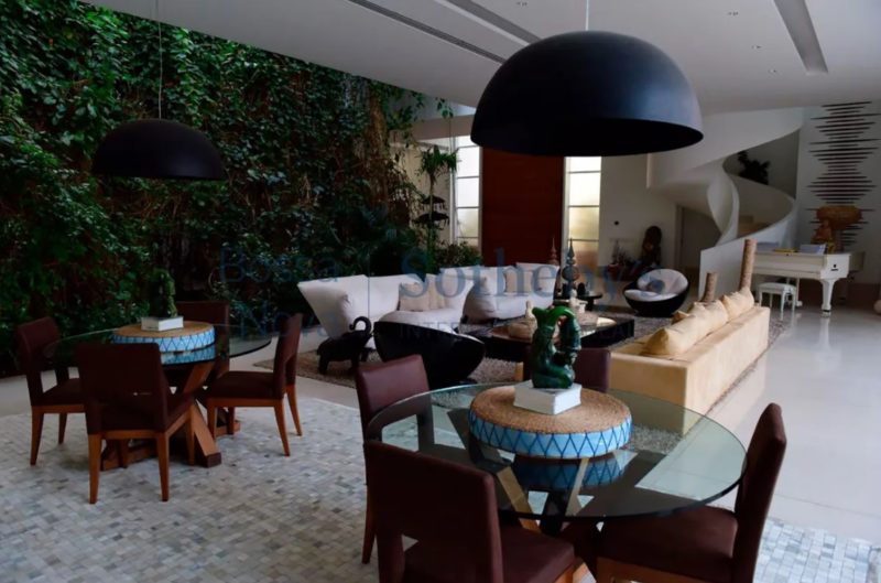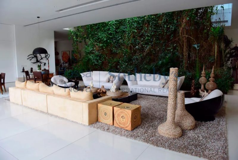 A residência de 2.626 m² na Barra da Tijuca tem cinco suítes, jardim de inverno, cozinha gourmet, garagem para seis carros, suíte para governanta e duas dependências no subsolo, além de outros espaços que ainda incluem piscina, jardim e canil.