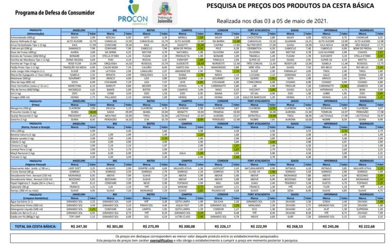 Mais de 40 itens da cesta básica foram pesquisados em Joinville. – Foto: Prefeitura de Joinville/Divulgação NDA diferença contatada chegou a mais de R$ 100 no valor total da cesta, que pode ser adquirida entre R$ 200,08 e R$ 301. Papel higiênico, absorvente, pão de forma e extrato de tomate foram os produtos que apresentaram maior aumento no preço neste mês.