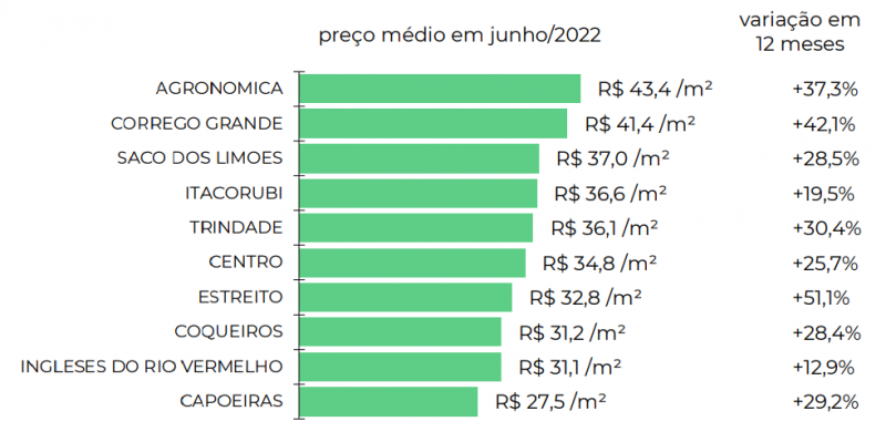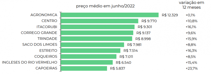 O valor da venda de imóveis subiu pouco mais de 1% em junho em Florianópolis. O valor acumulado dos últimos 12 meses é de 14,55%, custando R$ 9.603 o m². Veja os valores por bairro: