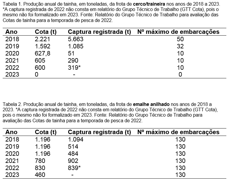 Ele também destaca que a produção dos dois pescados é sazonal. Ou seja, quando começa a safra da tainha, no inverno, a sardinha para de se reproduzir, e vice-e-versa. “A tainha se reproduz de maio a outubro, ela precisa do frio, águas com temperatura mais baixa, para desovar, enquanto a sardinha tem seu ciclo reprodutivo de outubro a maio, com águas mais quentes”, comenta o pesquisador.