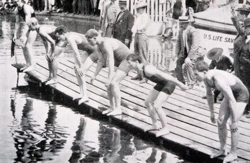 Natação com obstáculos. Disputada em Paris-1900, a prova era completamente bizarra. Os competidores tinham que escalar um poste, em seguida atravessar uma fileira de barcos, saltando de um para o outro, e finalmente nadar por baixo d’água até ultrapassar outra fileira de barcos. – Foto: Reprodução/ND - 4 de 10