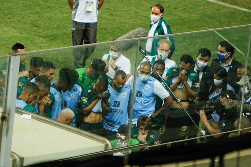 Imagem surreal: jogadores do América acompanham, no vídeo, o pênalti cobrado e convertido pelo centroavante Anselmo Ramon, na Arena Condá. Foto: VIVIANE MOREIRA/FUTURA PRESS/FUTURA PRESS/ESTADÃO CONTEÚDO – Foto: ESTADÃO CONTEÚDO/ND - 8 de 9