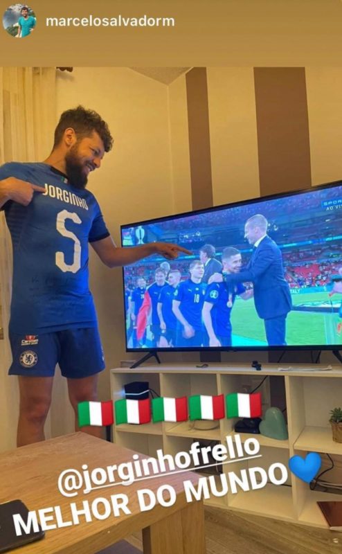 Além de Jorginho, os ítalos-brasileiros e companheiros de seleção Rafael Tolói e Emerson Palmieri, levantaram a taça neste domingo. Completam a lista o zagueiro Pepe, por Portugal (2016) e o volante Marcos Senna, pela Espanha (2008) – Foto: Reprodução/ Instagram