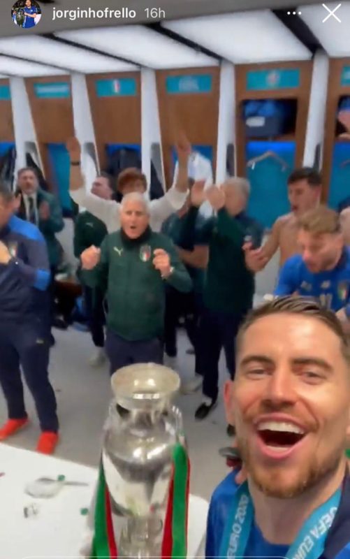 Jorginho comemorando a conquista com o grupo italiano nos vestiários de Wembley – Foto: Reprodução/Instagram