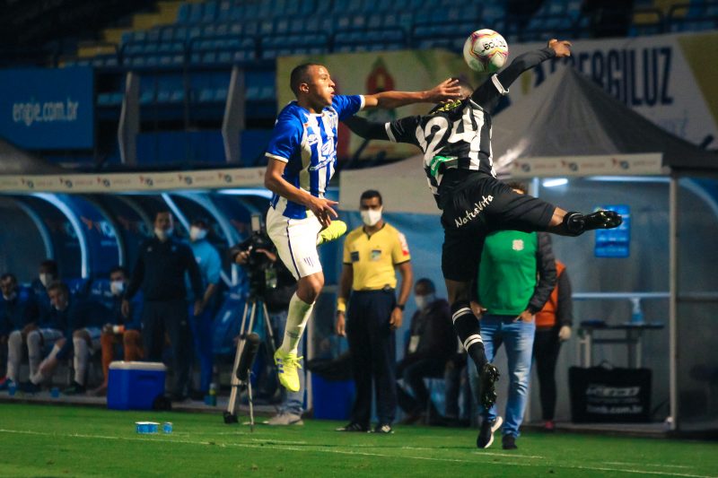 Rildo, em lance de aperto em cima de Rodolfo Castro, quase marca para o Avaí em lance da primeira etapa – Foto: Frederico Tadeu/Avaí FC - 6 de 10