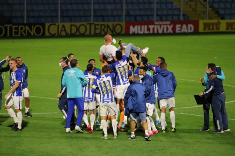 Marquinhos Santos, aniversariante do dia, foi erguido pelos atletas após o final da partida: 1 a 0 sobre o maior rival – Foto: Frederico Tadeu/Avaí FC