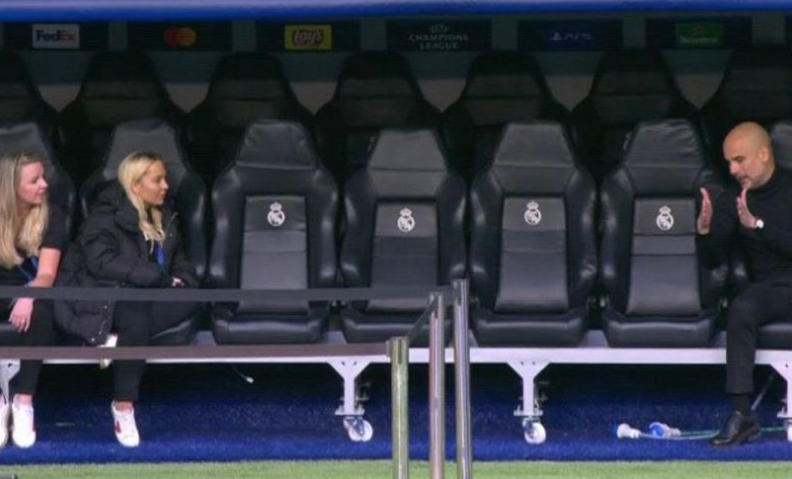 Na imagem Pep Guardiola está conversando com duas jovens, provavelmente do quadro de organização do jogo entre Real Madrid e Manchester City, e faz um gesto mostrando o tamanho de alguma coisa.