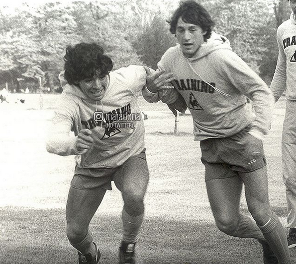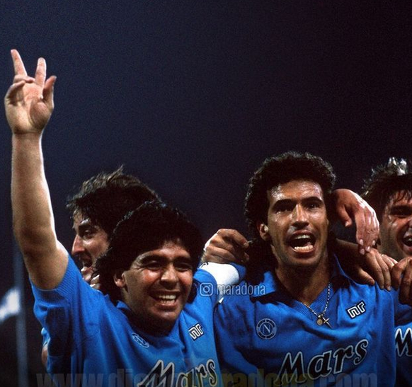 No time italiano fez história. Foram dois Scudettos/Liga Europa (86/87 e 89/90), uma Copa Itália e uma Supercopa. Na foto, ele aparece junto ao jogador Antônio Careca – Foto: Reprodução/Instagram Via Maradona - 7 de 7
